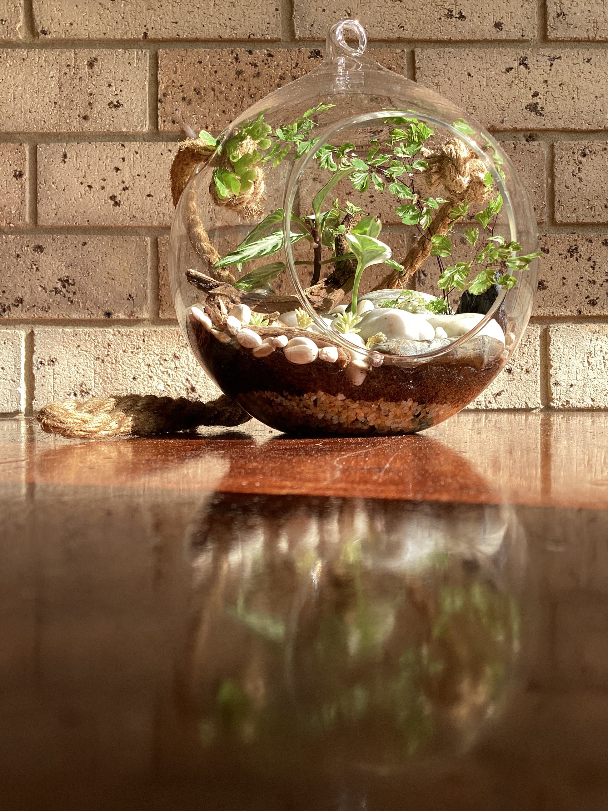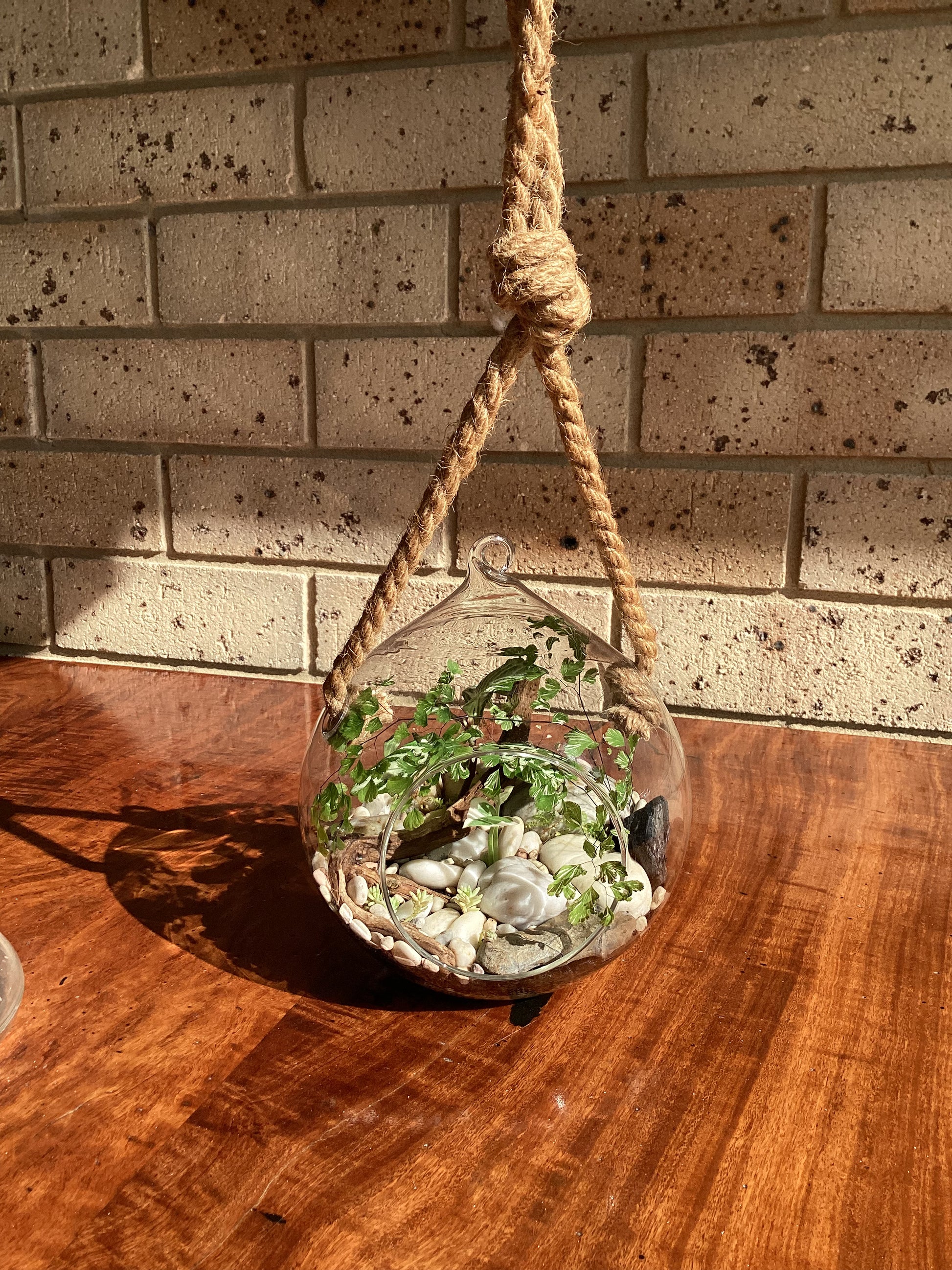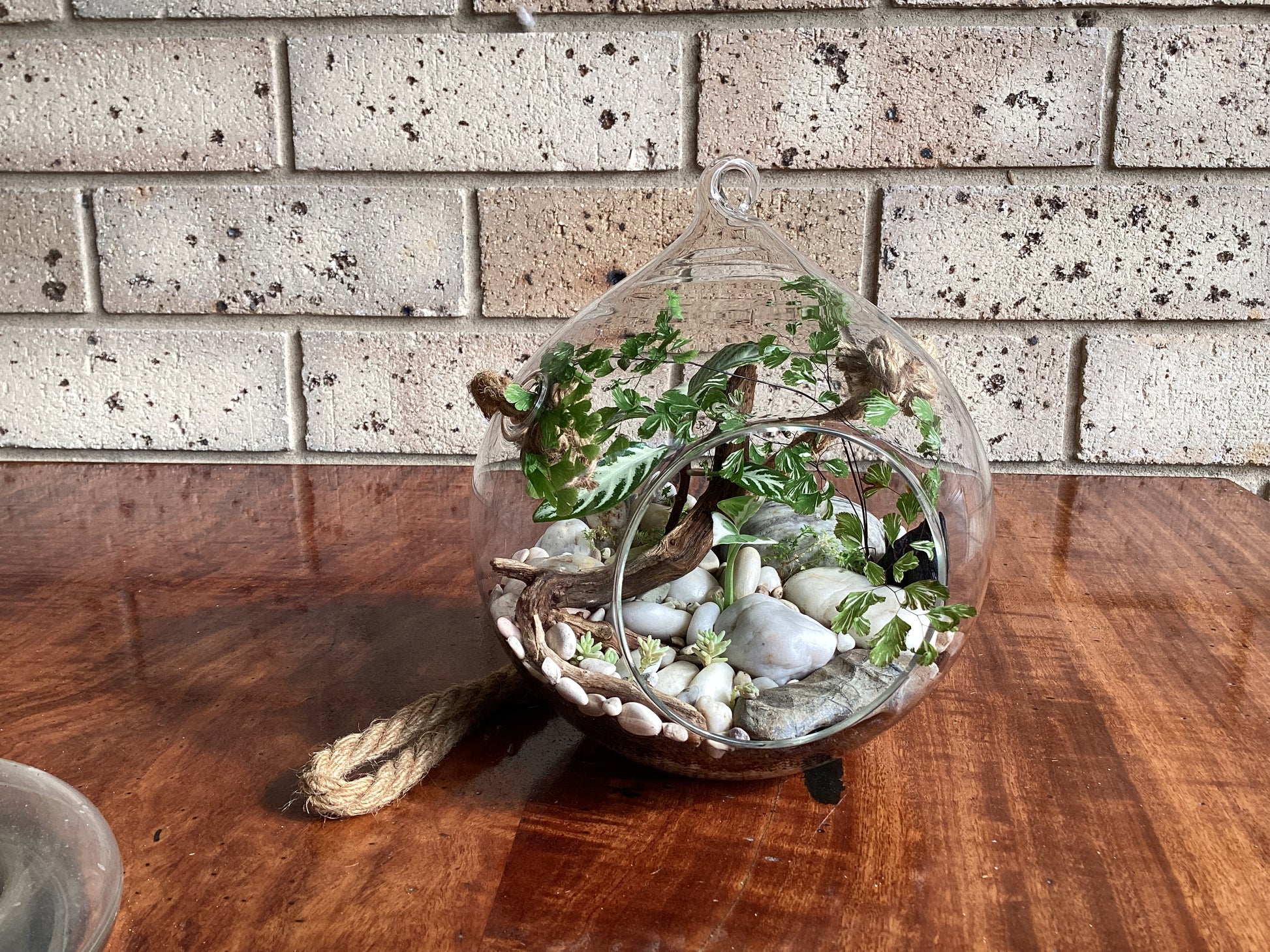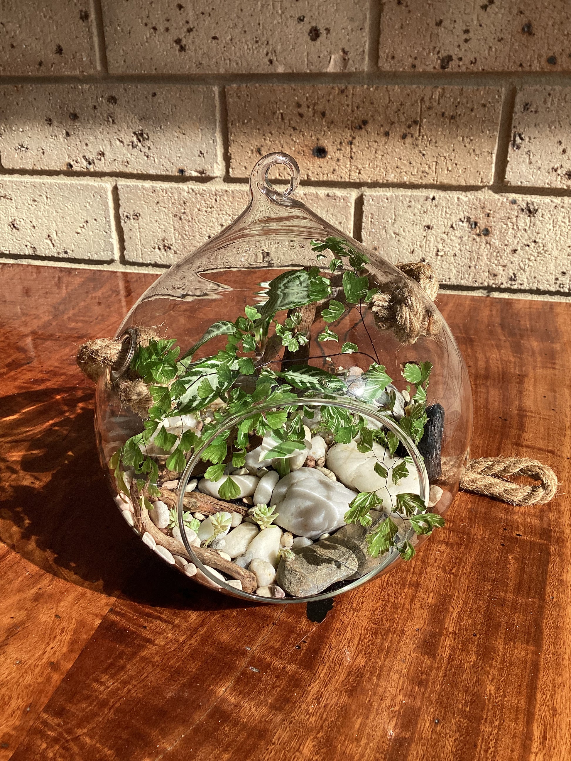 Elevate your space with the Hanging Orb Zen Garden, a masterpiece of white and green hues and textures. As this garden thrives, it enchants with nature's wonder and beauty. This distinctive piece is a gentle reminder to cherish and savor life's simple pleasures.
