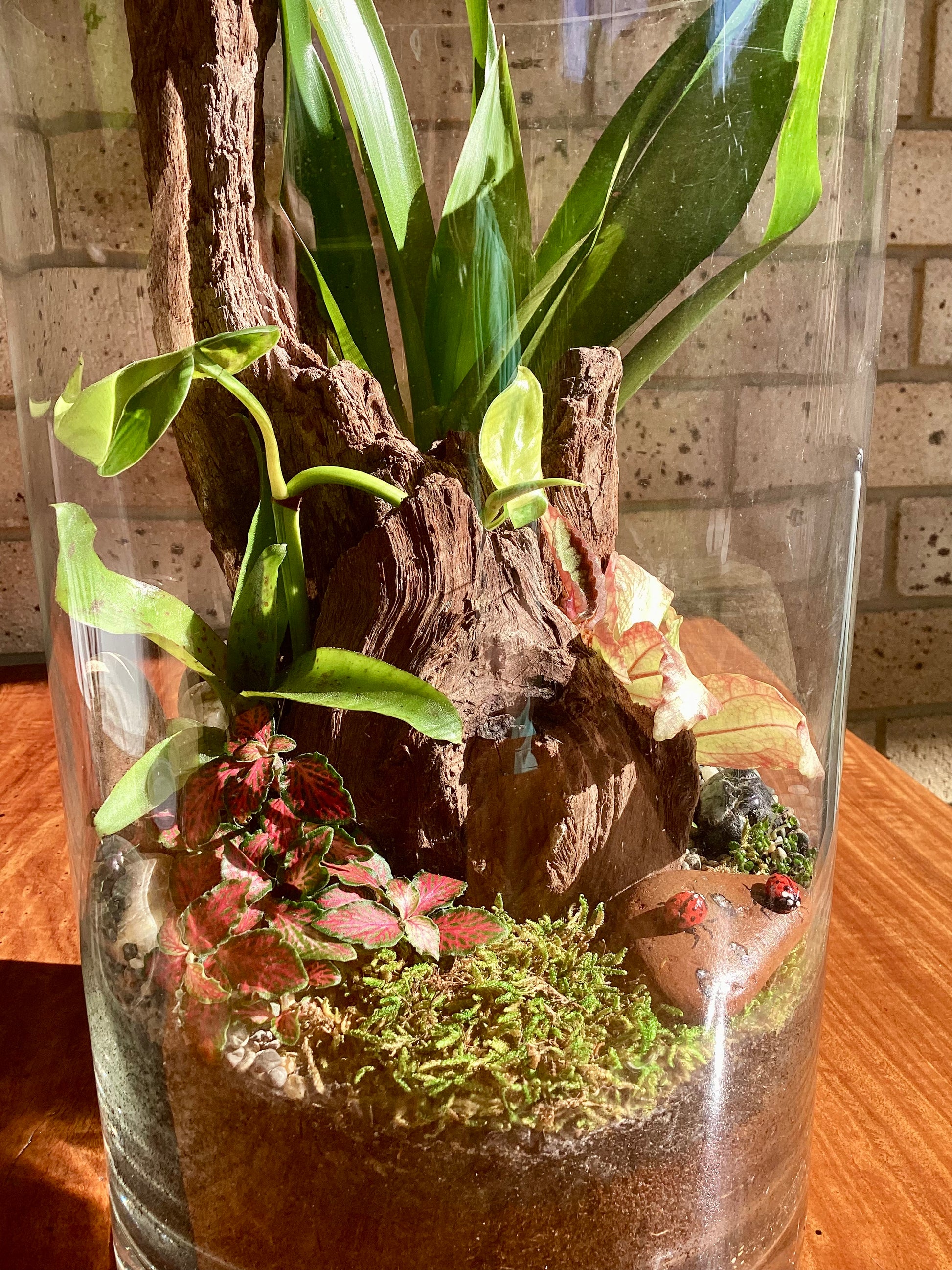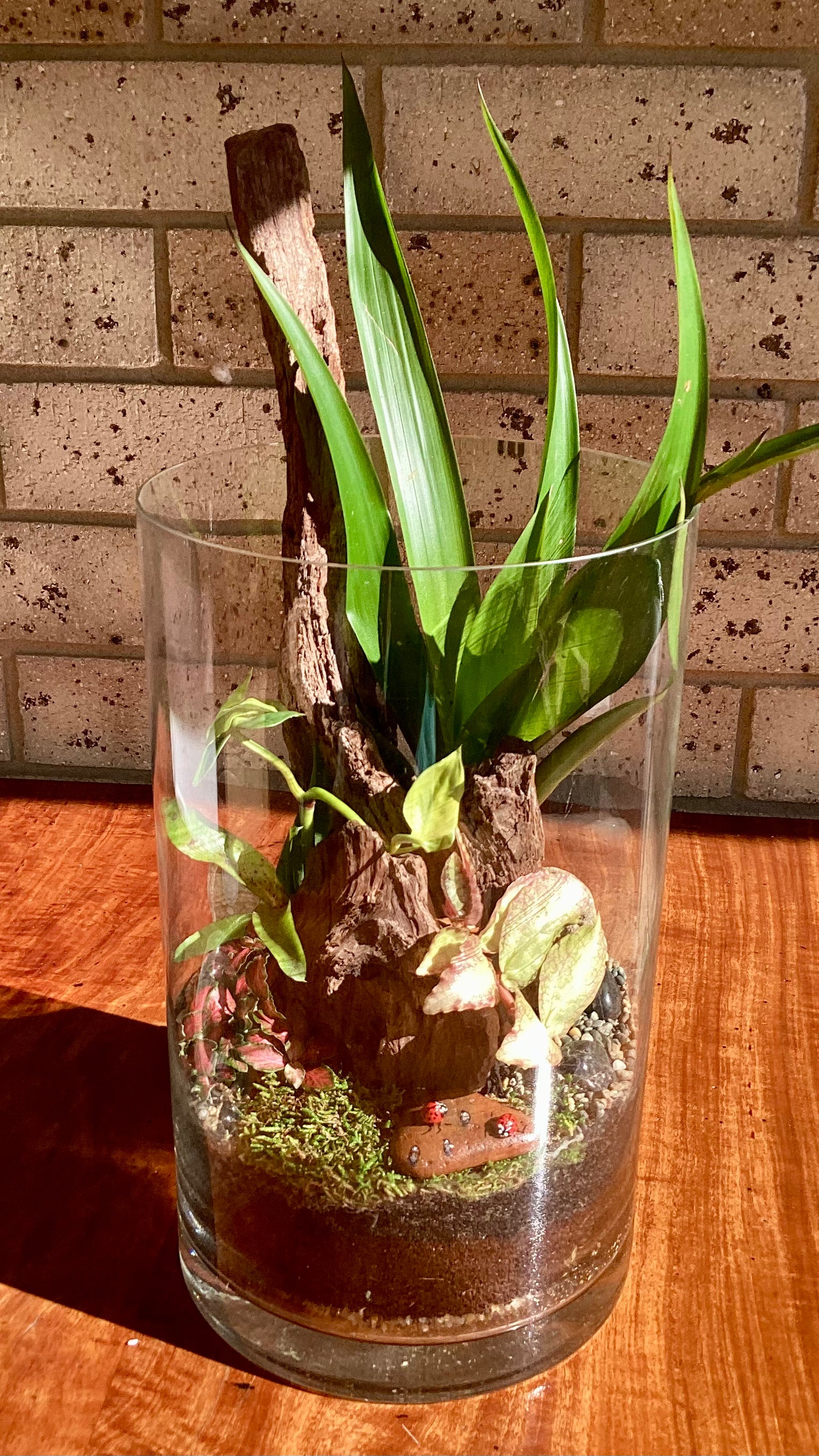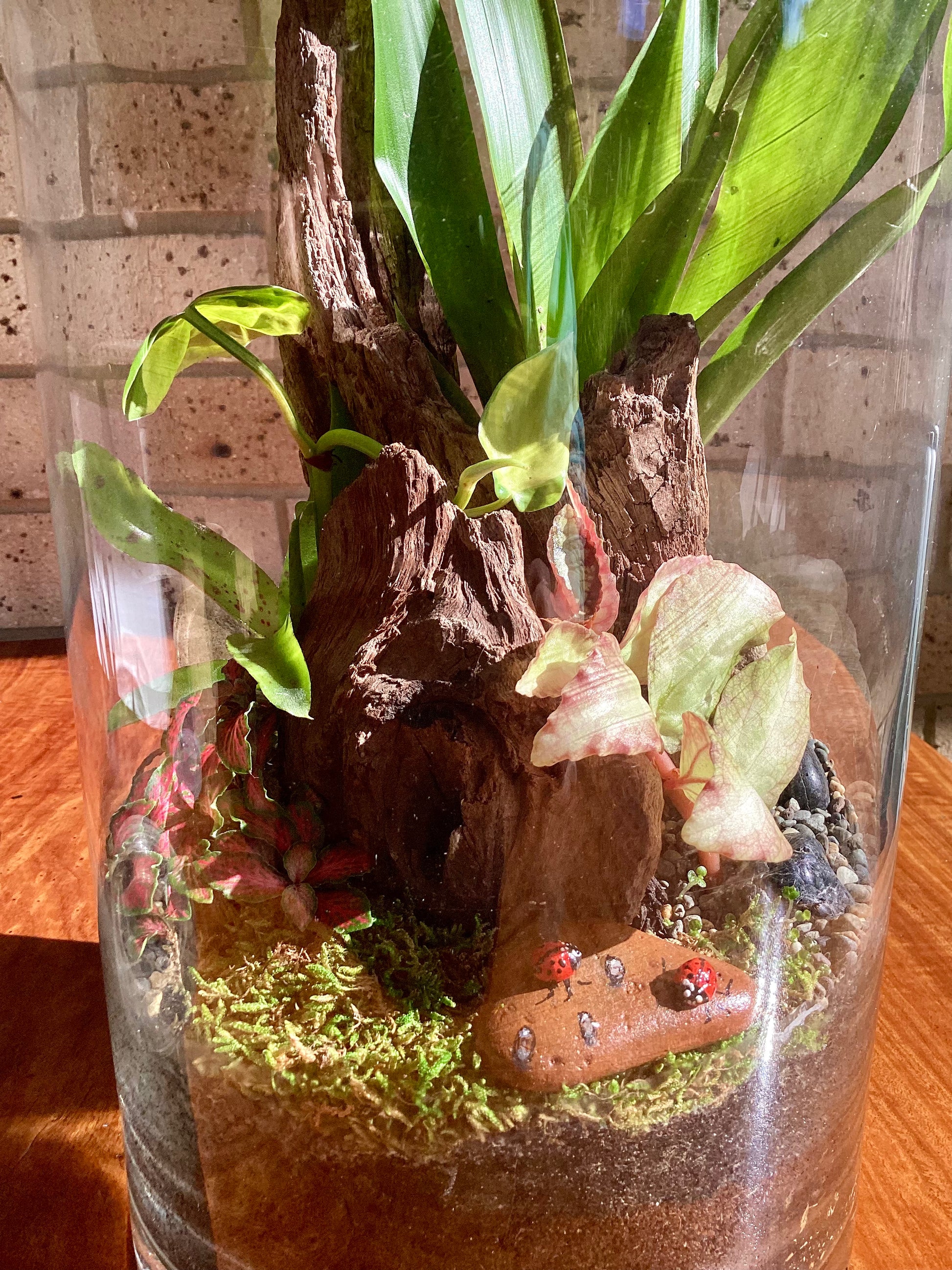 Transform any space into a serene sanctuary with this captivating terrarium. Nestled around a unique piece of timber, it boasts a vibrant tapestry of colors and textures. A beautifully hand-painted rock, adorned with tiny lady beetles, adds a whimsical touch to this oasis of zen. Effortlessly low maintenance, it's a stunning center piece for your shelf, desk, or any chosen spot, inviting tranquility and charm into your home.