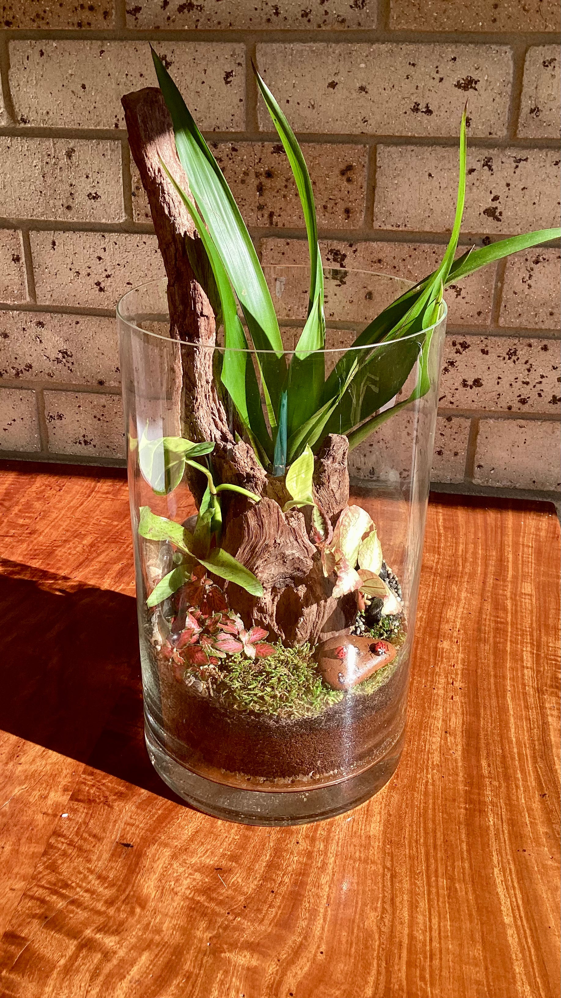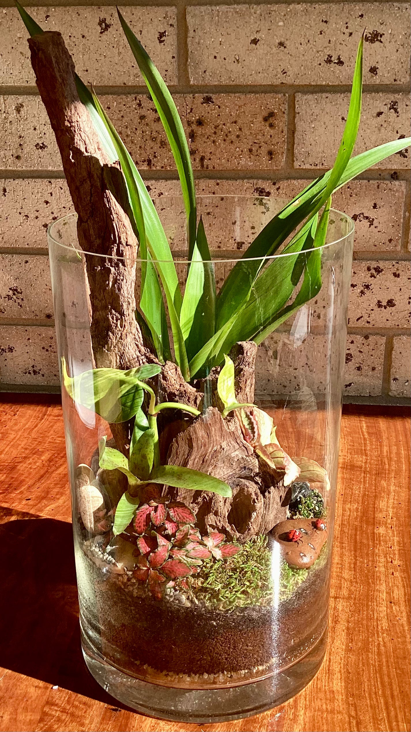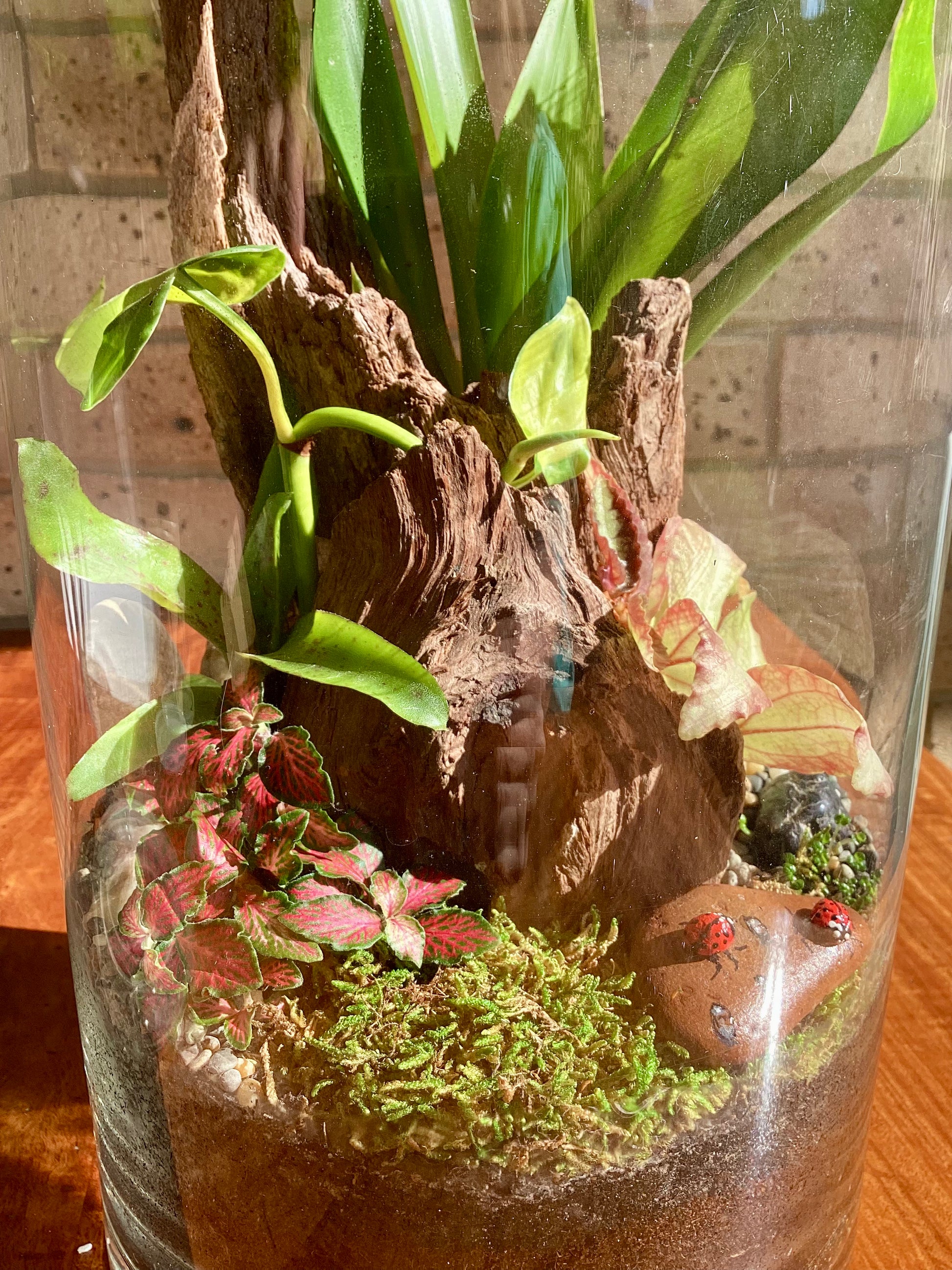 Transform any space into a serene sanctuary with this captivating terrarium. Nestled around a unique piece of timber, it boasts a vibrant tapestry of colors and textures. A beautifully hand-painted rock, adorned with tiny lady beetles, adds a whimsical touch to this oasis of zen. Effortlessly low maintenance, it's a stunning center piece for your shelf, desk, or any chosen spot, inviting tranquility and charm into your home.